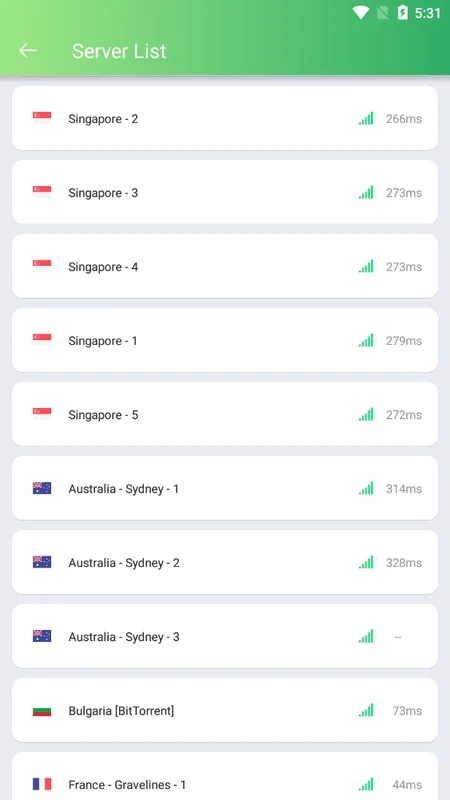 このアプリの真髄はシンプルさです。メイン画面にアクセスすると、愛らしいパンダのロゴが描かれたインターフェースと、アプリのオン/オフを切り替える大きなボタンが1つあります。メイン画面には数十ものサーバーが表示されており、希望する場所への接続を簡単に選択できます。